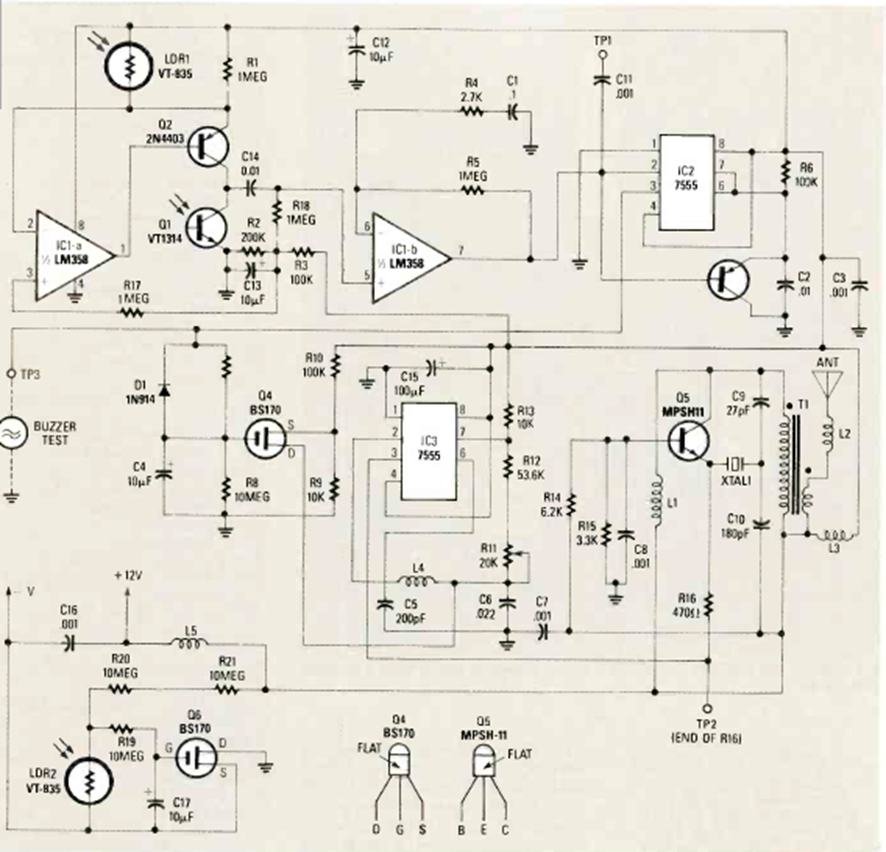 Este es el receptor del sistema de alarma anterior. El circuito es de Radio Electronics de abril de 1989 y tiene un LDR como sensor. Se deben utilizar recursos ópticos para mejorar el rendimiento.