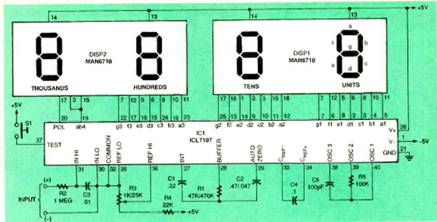 En la figura tenemos la forma básica de utilizar el contador de 3 dígitos y medio 7107. El circuito es de Electronics Now de noviembre de 1996. Utiliza dos pantallas duales.