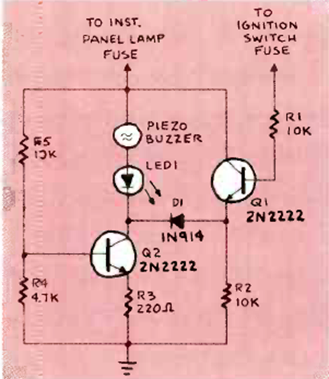 El objetivo de este circuito es avisar al conductor cuando apaga el coche y deja las luces encendidas. El circuito es de una Radio Electronics de abril de 1987.