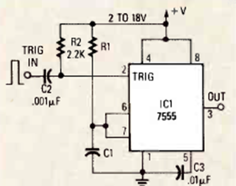 Este circuito es similar al anterior con la diferencia de que puede ser disparado electrónicamente. El circuito es de la revista Radio Electronics de abril de 1988.