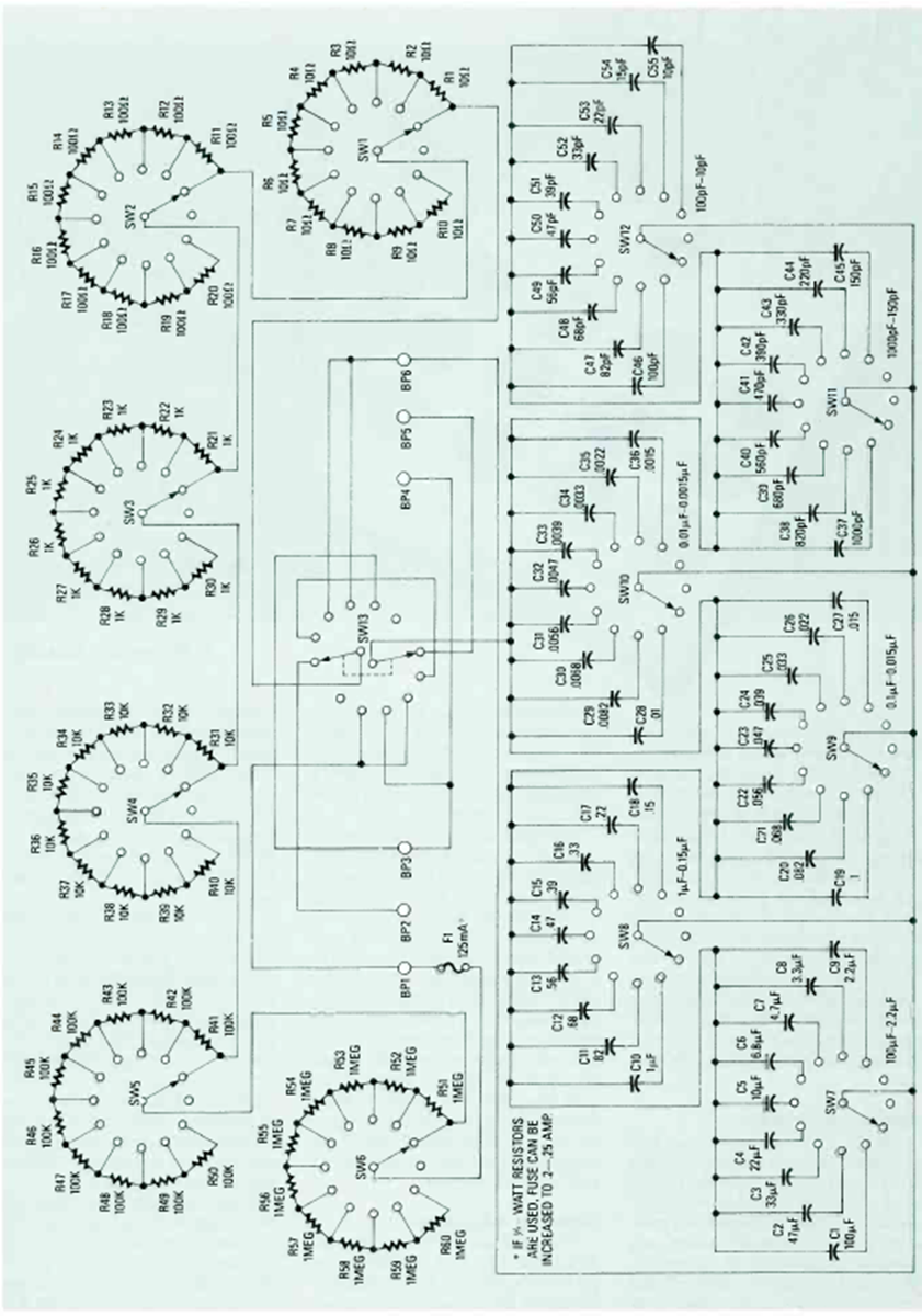 Esta sofisticada década de resistencias de sobremesa se encontró en la revista Radio Electronics de noviembre de 1989. El circuito debe utilizar resistencias de precisión.