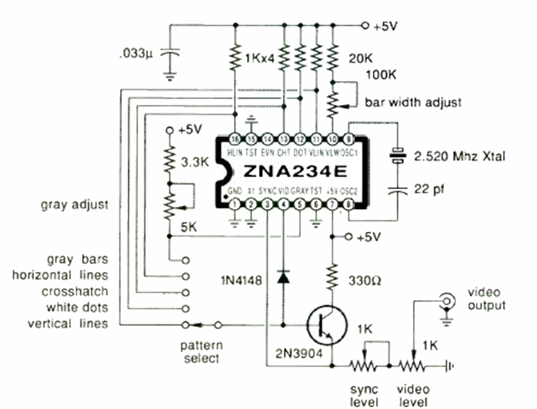Este generador de patrones para TV analógica monocromática se encontró en la edición de julio de 1991 de la revista Radio Electronics. El circuito genera una tensión que debe aplicarse a un modulador.