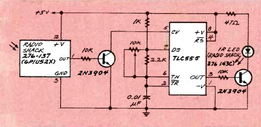 Basado en el 276-137 de Radio Shack, este circuito fue encontrado en la edición de diciembre de 1995 de la revista Electronics Now. El circuito controla un LED, pero podría tener un relé en su lugar.