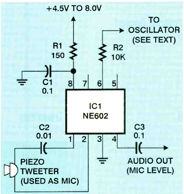Este circuito consta de un preamplificador para señales ultrasónicas que utiliza un tweeter piezoeléctrico como micrófono. El circuito es de una revista Electronics Now de agosto de 1999.