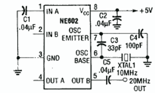 Este circuito genera una señal sinusoidal de 20 MHz a partir de un cristal de 10 MHz. Se encuentra en la edición de 1992 del Electronics Experimenter Handbook. El circuito utiliza un único circuito integrado de la época.