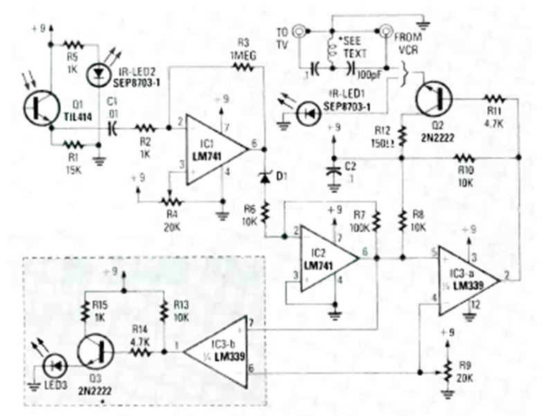 Este circuito apareció en el Radio Electronics Exprimenter Hanbook de 1991. El circuito es para controles remotos de la época que son más lentos que los actuales, y es posible que no funcionen con los tipos modernos.