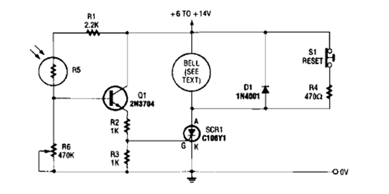 Encontramos este circuito que activa un SCR en la Enciclopedia de Circuitos Electrónicos, volumen 5 de 1995. El circuito se alimenta con voltaje según la carga de advertencia.