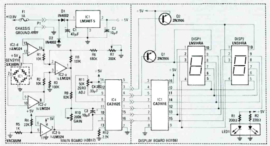 Este manómetro digital de dos dígitos se encontró en la edición especial de 1992 del Radio Electronics Experimenter. Los circuitos integrados convertidores A/D son poco comunes hoy en día.