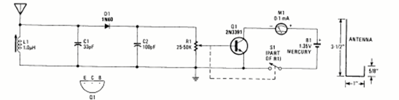 Encontrado en Special Projects de Radio Electronics de 1993, este circuito indicador analógico utiliza un amplificador de transistor. La indicación es para la banda de 27 MHz.