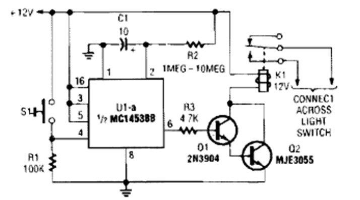 Este circuito, indicado para uso automotriz, se encontró en un producto de electrónica popular de los años 90. Utiliza un transistor de potencia que debe estar equipado con un disipador de calor.