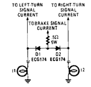 Este circuito, presente en un producto de Popular Electronics de los años 90, activa un intermitente cuando las luces están encendidas. El circuito se puede adaptar para LED.