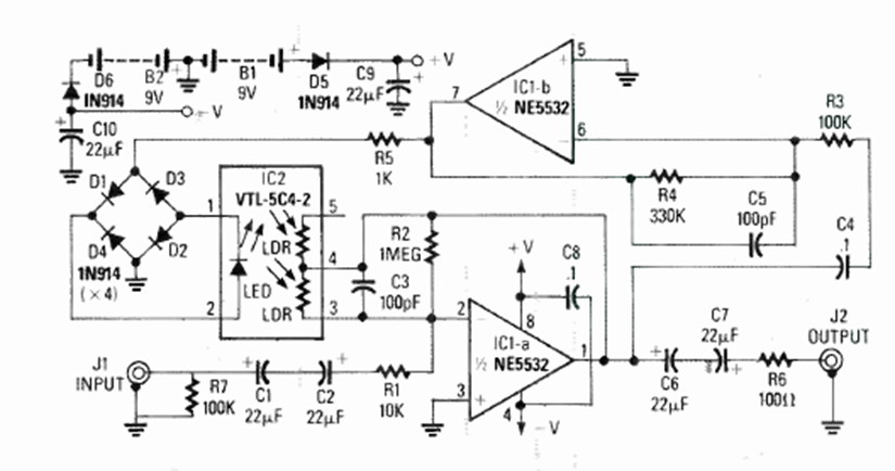 Encontramos este circuito en la edición especial de 1992 de la revista Radio Electronics Handbook. El circuito utiliza un acoplador óptico como potenciómetro electrónico.