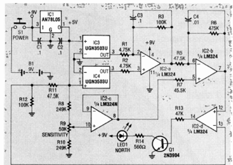 Encontramos este circuito en la edición de 1993 de la revista Electronics Experimenter Handbook. El circuito utiliza dos sensores de efecto Hall de la época.