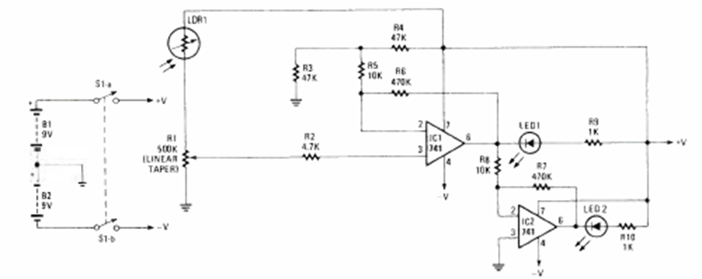 Adecuado para trabajos de fotografía, este circuito es de un Radio Experimenter Special Projects de 1993. El sensor es un LDR y se utilizan dos amplificadores operacionales comunes.