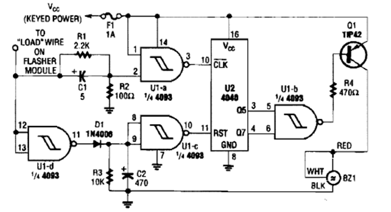 Este circuito emite una señal cuando la direccional está encendida, lo que evita que se olvide en esta condición. El circuito se encontró en un producto de Popular Electronics de los años 80.
