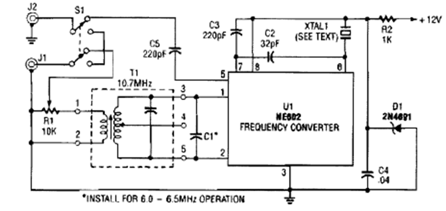 Encontramos este circuito para recibir ondas cortas en una radio de onda media en un equipo de potencia Hobbyst Electronics de 1986. El circuito tiene la banda de recepción dada por T1, que puede ser una FI de FM.