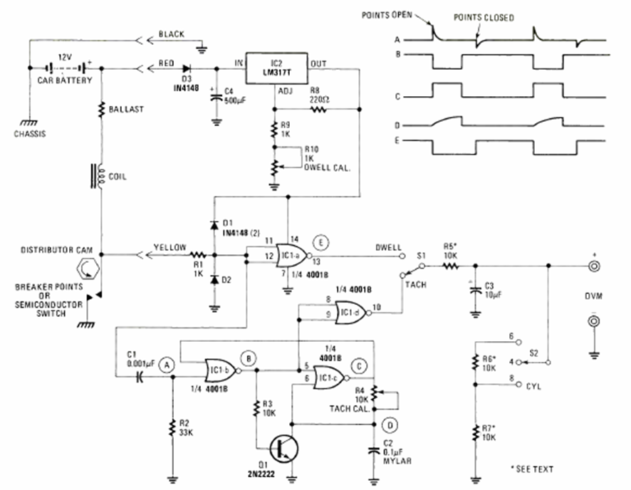 Este circuito para coches antiguos con control de encendido mecánico fue encontrado en la revista Electronics Experimenter Special Projects de 1983. El circuito utiliza componentes comunes y funciona para automóviles de 12 V.