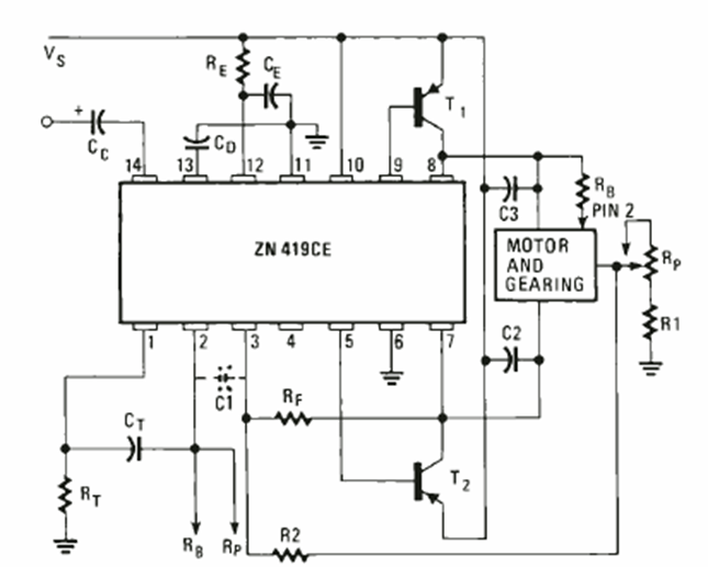 Utilizando un ZN419CE este circuito fue encontrado en la revista Electronics Experimenter Special Projects de 1981. La corriente del motor depende básicamente de T1 y T2.