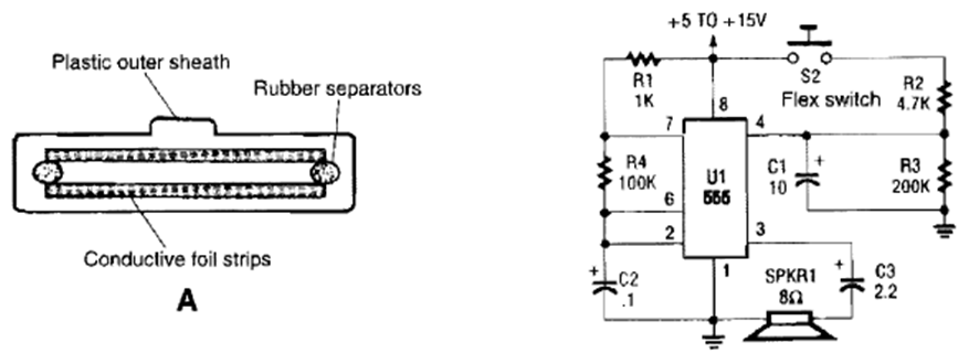 Este circuito con sensor de presión se obtuvo de la Enciclopedia de Circuitos Electrónicos, volumen 5 de 1995. Observe la construcción del sensor con caucho y conductores.