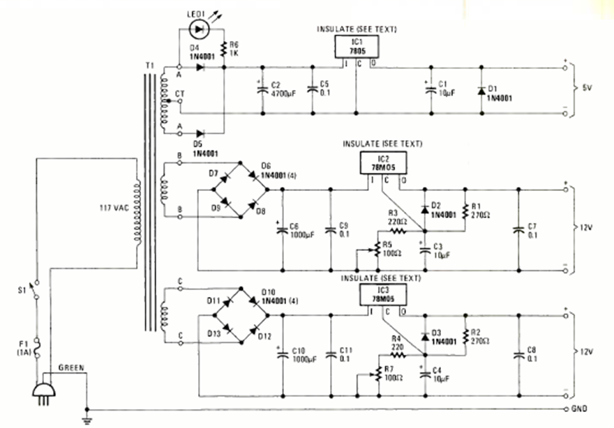 Esta fuente de alimentación de banco tiene 3 salidas de voltaje que se pueden utilizar simultáneamente. Lo encontramos en la sección de Electronics Experimenter Special Projects de 1983. Los circuitos integrados deben estar equipados con disipadores de calor.