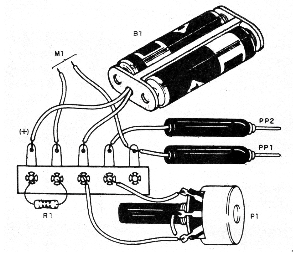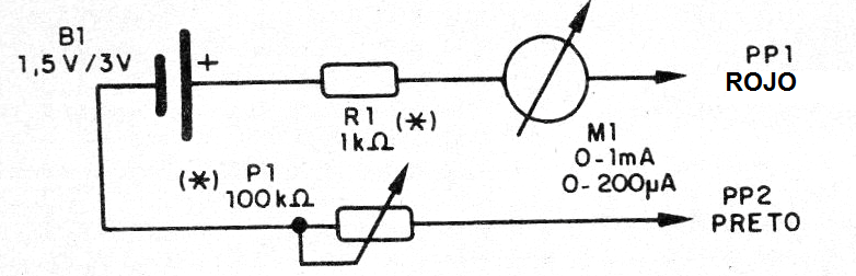 Las puntas de prueba, roja y negra, pueden ser adquiridas o bien improvisadas con clavos grandes encapados. La escala será fea tomando como patrones resistores de valores conocidos. Para utilizar el aparato, en primer lugar, las puntas de prueba y ajuste P1 para obtener la deflexión total o indicación de cero de la escala de resistencias.