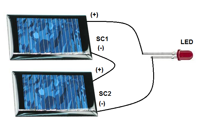 Sólo hay que observar la polaridad y conectar el LED a las dos celdas que se deben asociar en serie, preferiblemente haciendo la conexión con un par de hilos de al menos 1 metro de longitud. De esta forma, el LED queda alejado de la fuente de luz, pudiéndose observar más fácilmente las luces. En la figura abajo la conexión de los elementos.