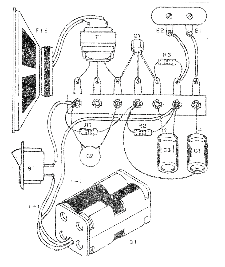 El pequeño transformador es del tipo de salida encontrado en viejos radios transistorizados. Para la entrada se puede utilizar un cable con enchufe, como en los auriculares comunes, o dos hilos con garras.