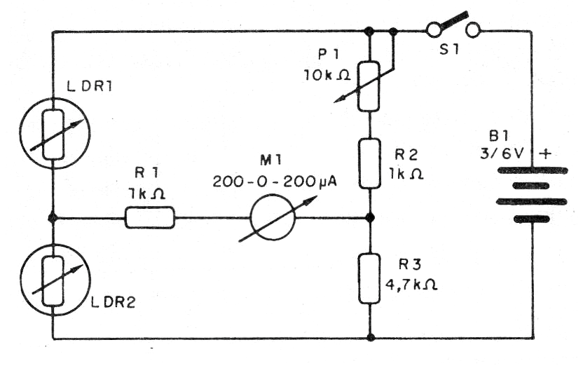 Con este circuito es posible hacer la comparación de tonos de tintas, intensidad de fuentes luminosas o de grados de iluminación. El circuito consiste en un puente usando sensores dos LDR. Cuando las intensidades de luz en los LDR se igualan el puente equilibra con la indicación de nulo en el instrumento, un microamperímetro con cero en el centro de la escala.
