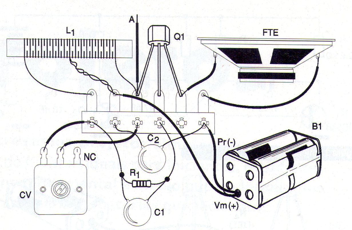 El capacitor variable de sintonía (así como el núcleo de ferrita) puede obtenerse de una radio AM fuera de uso. Como micrófono, usamos un pequeño altavoz que también puede ser aprovechado del mismo radito fuera de uso.