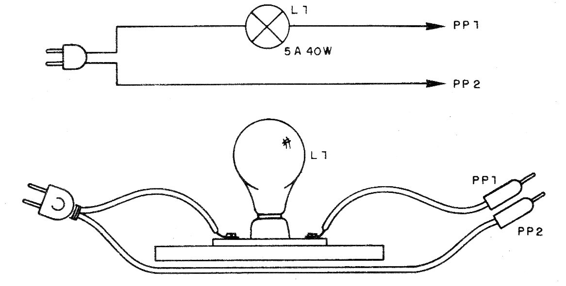 Hilos, cables, electrodomésticos, lámparas incandescentes, fusibles, llaves y transformadores con primarios para la red de energía pueden ser probados con esta útil lámpara de prueba.