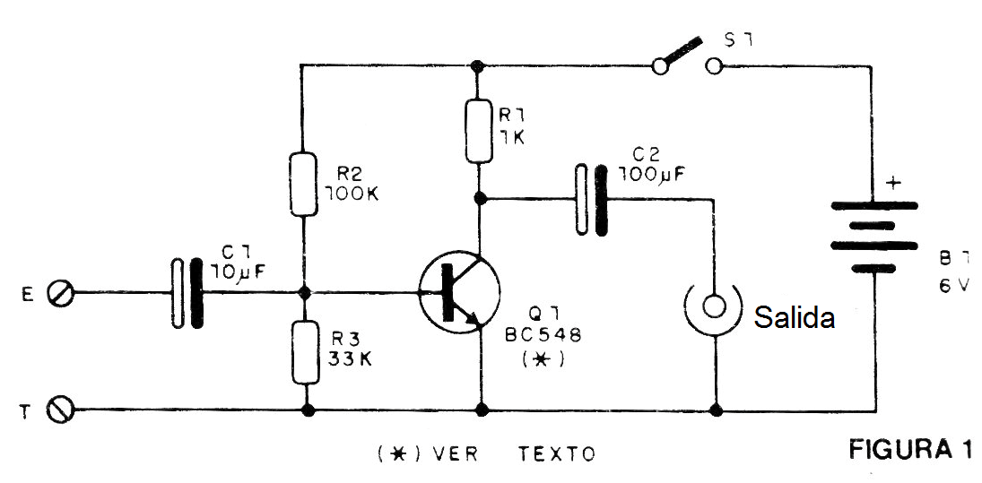 Es un circuito simple que sirve para aumentar la sensibilidad de los auriculares de alta impedancia (cristal o magnético por encima de 2 000 ohms).