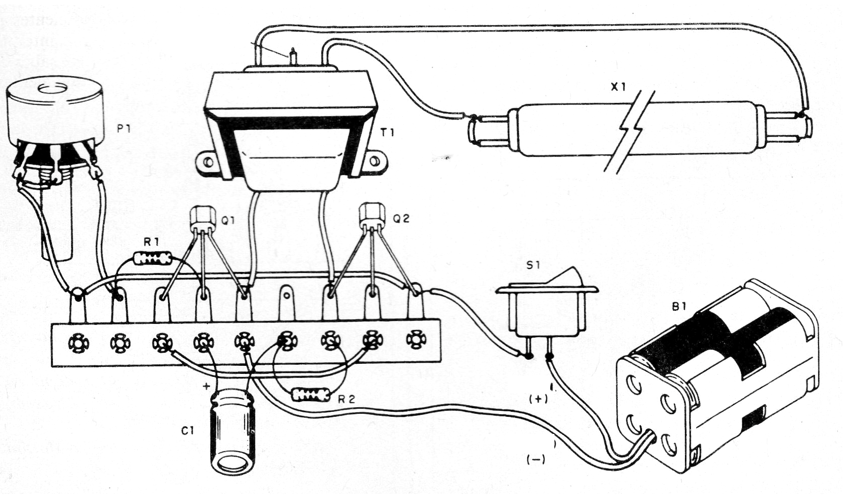 Presentamos un circuito experimental con sólo dos transistores el cual, alimentado por pilas puede hacer que lámparas neón o fluorescente parpadeen en una frecuencia que puede ajustarse a 1 a cada minuto hasta 10 por segundo. El circuito es simple y puede ser usado en demostraciones o para señalización.