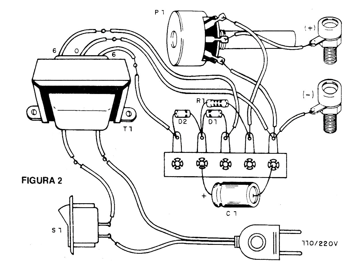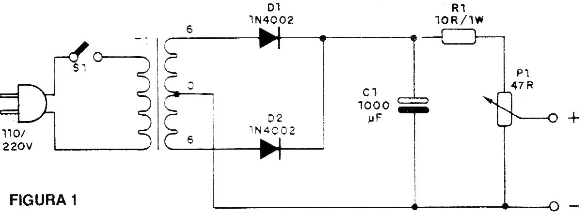 Este circuito tiene por finalidad alimentar aparatos y circuitos de 0 a 6 V con corrientes hasta unos 250 mA, sin problemas. El ajuste de la tensión de salida es hecho por un potenciómetro de hilo (no utilice de otro tipo) y el filtrado obtenido a través de un capacitor de 1 000 uF. El circuito no tiene regulación automática.