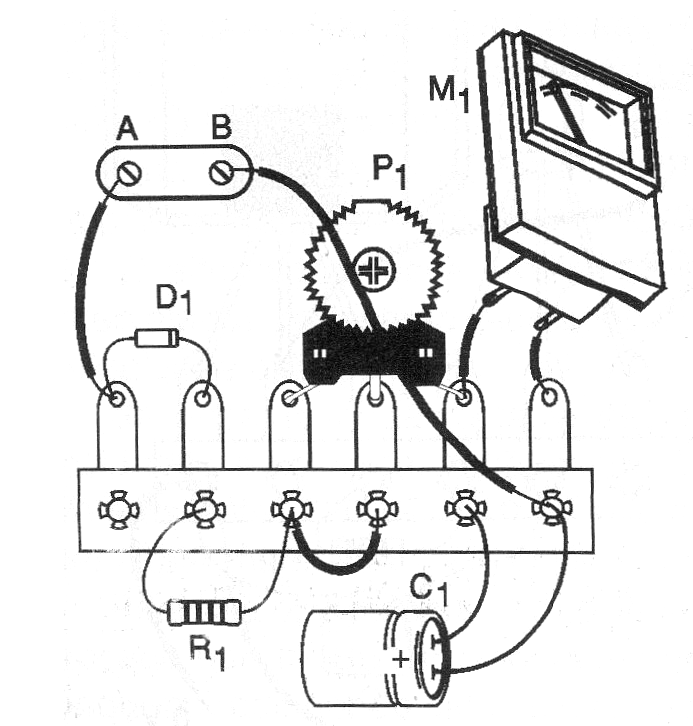 Para ajustar el aparato, conecte los puntos A y B a la salida de su sistema de sonido (hilos que van a los altavoces). A continuación, abra ligeramente el volumen y ajuste P1 hasta que la aguja indicadora oscile suavemente al ritmo de la música. Si observa que el puntero tiende a difuminar hacia el lado equivocado, invierta las conexiones del instrumento M1.