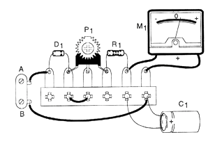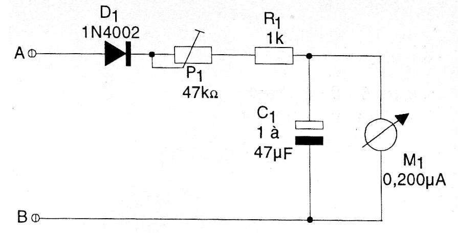 Para ajustar el aparato, conecte los puntos A y B a la salida de su sistema de sonido (hilos que van a los altavoces). A continuación, abra ligeramente el volumen y ajuste P1 hasta que el indicador oscile suavemente al ritmo de la música. Si observa que el puntero tiende a difuminar hacia el lado equivocado, invierte las conexiones del instrumento M1.