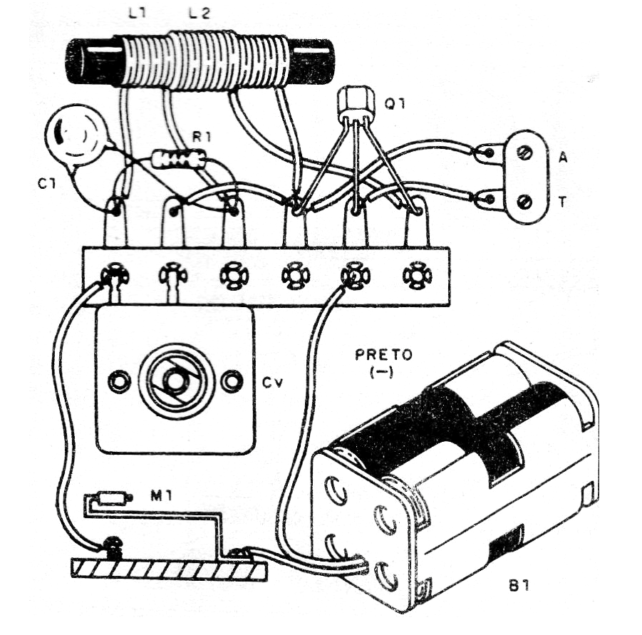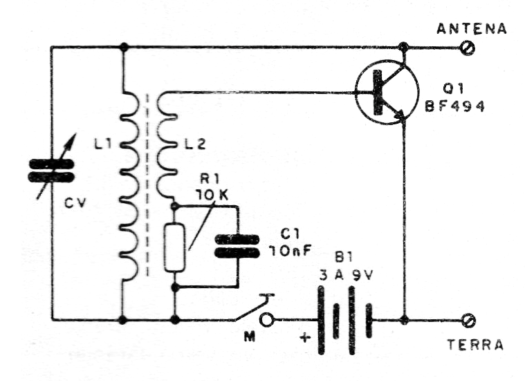 Como podemos ver por el diagrama, tenemos un oscilador con el transistor BF494 o equivalente como el 2N2218, para mayor alcance. La resistencia de base debe ser obtenida experimentalmente entre 2k2 y 10k, eligiéndose lo que resulte en mejor rendimiento.