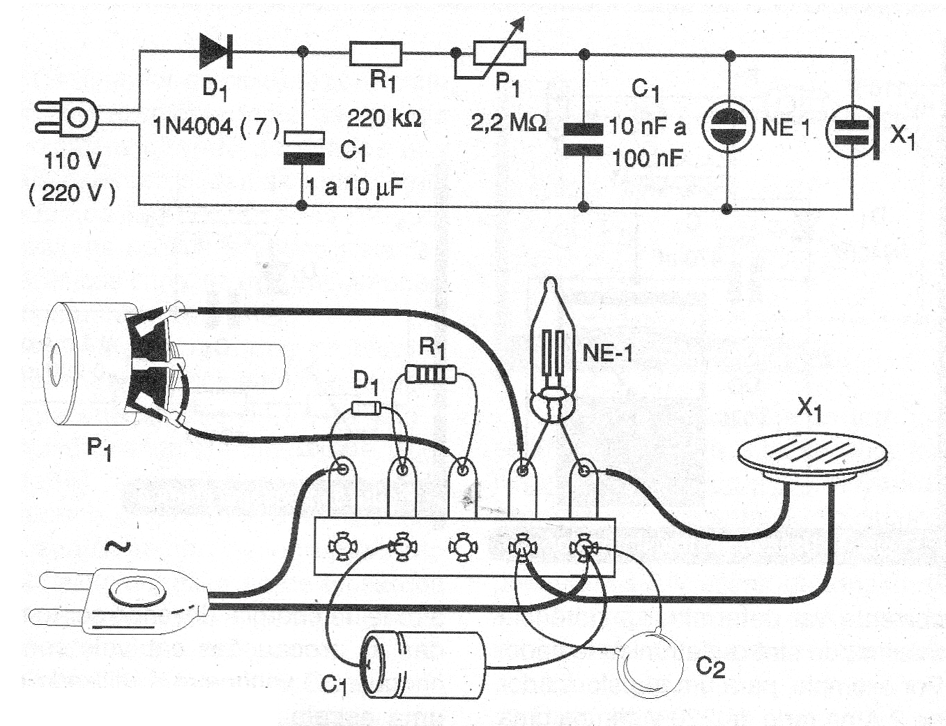 La alimentación del circuito debe realizarse con una tensión superior a 90 V, pues la mayoría de las lámparas de neón comunes necesitan al menos 80 V para ionizar. Cualquier lámpara común puede usarse y el circuito funcionará tanto en la red de 110 V como 220 V.
