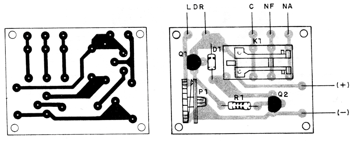 El circuito funciona tanto con relés de 6 V como 12 V y el sensor es un LDR común. El ajuste de sensibilidad se realiza a través de un trimpot o de un potenciómetro.