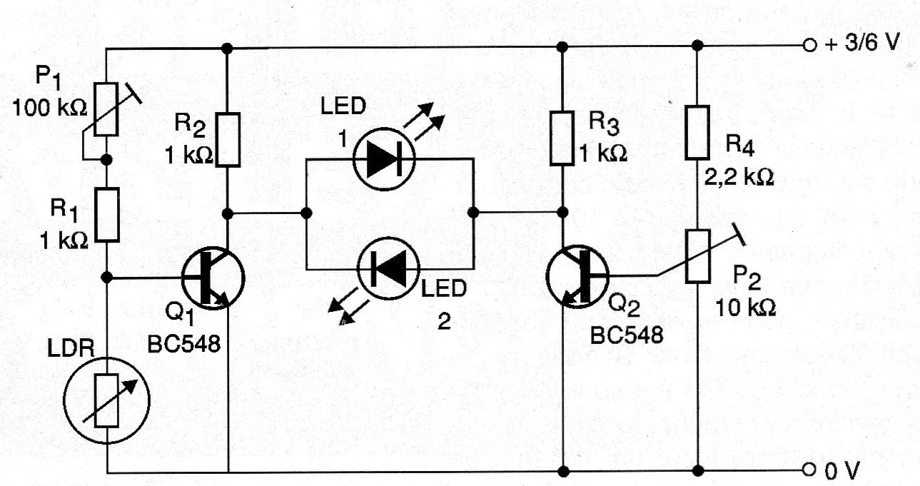 El circuito puede ser alimentado por dos o cuatro pilas pequeñas y el LDR puede ser de cualquier tipo o tamaño.