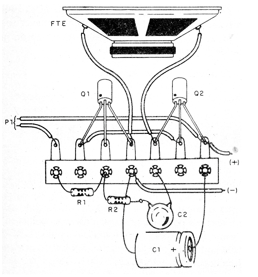 El circuito consiste en un oscilador complementario donde la frecuencia es determinada por el ajuste de P1. El circuito funciona típicamente con tensiones de 0,4 a 1,5 V. En la figura 1 tenemos el diagrama completo de este oscilador de audio para energía alternativa.