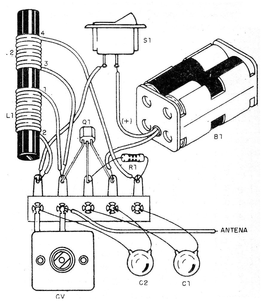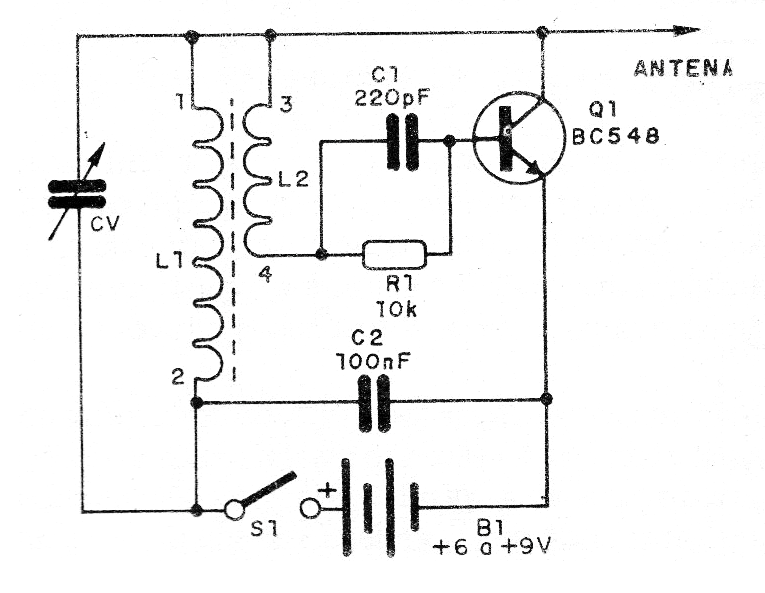 El circuito es alimentado por tensiones de 6 a 9 V obtenidas de pilas, fuente o batería. Los componentes son comunes. La bobina consiste en una bobina con 100 espiras de hilo de 26 a 30 AWG en un bastón de ferrita que resulta en el devanado con terminales y 1 y 2 en el diagrama y, al lado, una bobina con 30 espiras del mismo hilo, resultando en los devanados con terminales 3 y 4.