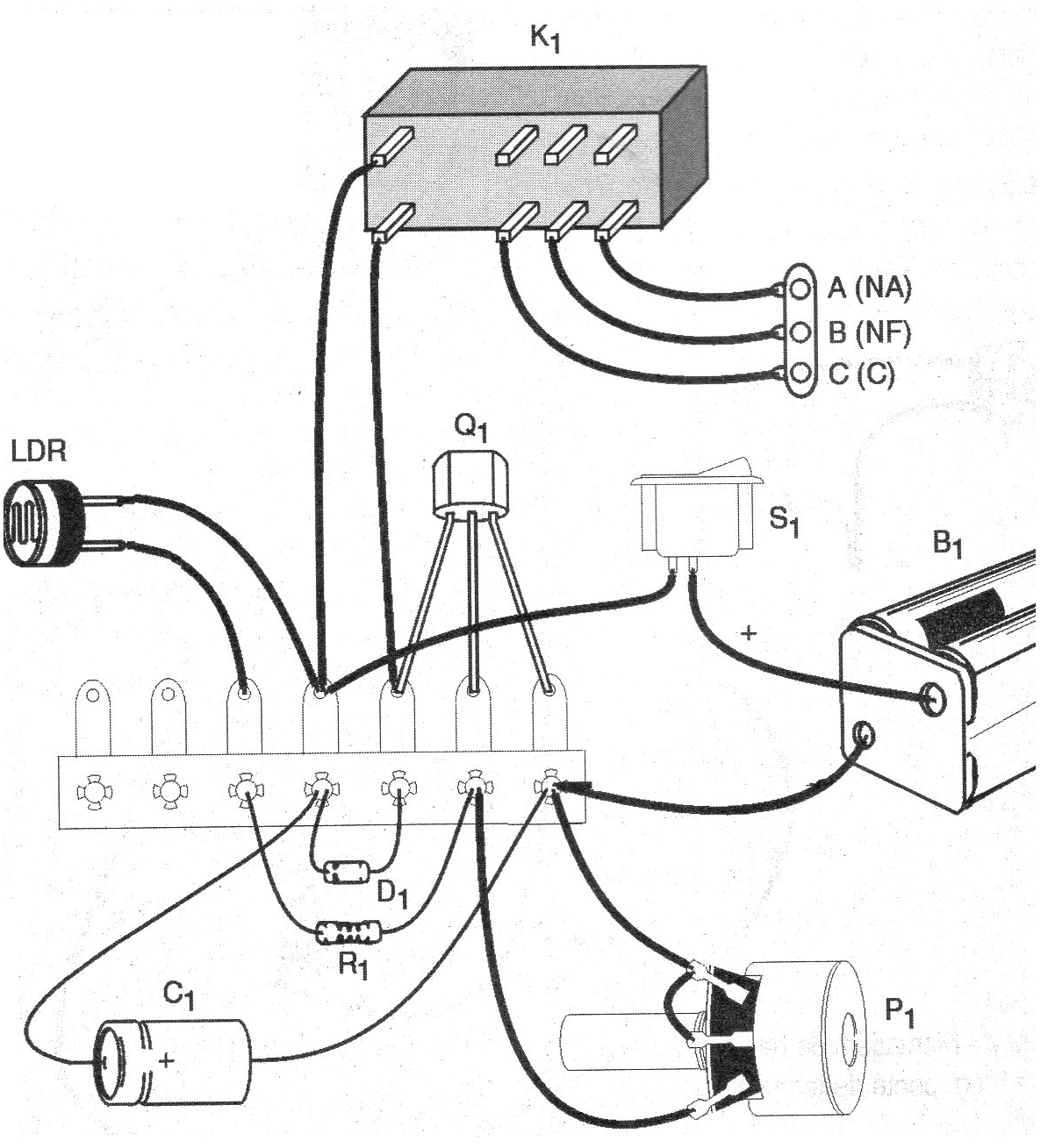 En la figura 1 tenemos el circuito que utiliza como sensor un LDR común y cuya sensibilidad es ajustada en P1.