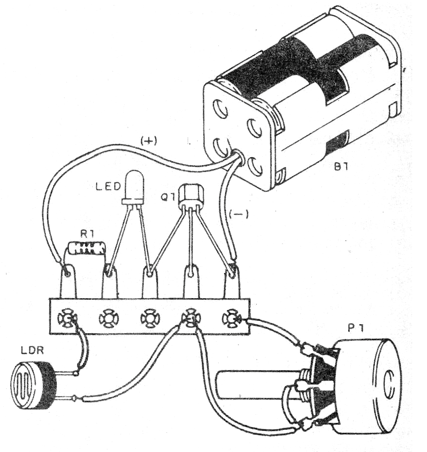 El circuito tiene su sensibilidad controlada por un potenciómetro y es alimentado por 4 pilas pequeñas. Cualquier LDR puede usarse y el LED puede ser de cualquier color. En la figura 1 tenemos el diagrama completo del aparato.