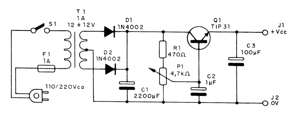 El circuito utiliza pocos componentes y el transistor de potencia debe estar dotado de radiador de calor. El transformador tiene un secundario de 12 + 12 V con 1 A. La fuente no tiene protección contra cortocircuitos en la salida. El diagrama completo de la fuente se muestra en la figura 1.