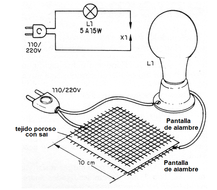 El sensor está formado por dos pantallas de alambre de 10 x 10 cm, entre ellas un pedazo de tejido seco con un poco de sal. La lámpara debe ser incandescente de 5 a 15 W. No utilice otro tipo de lámpara.