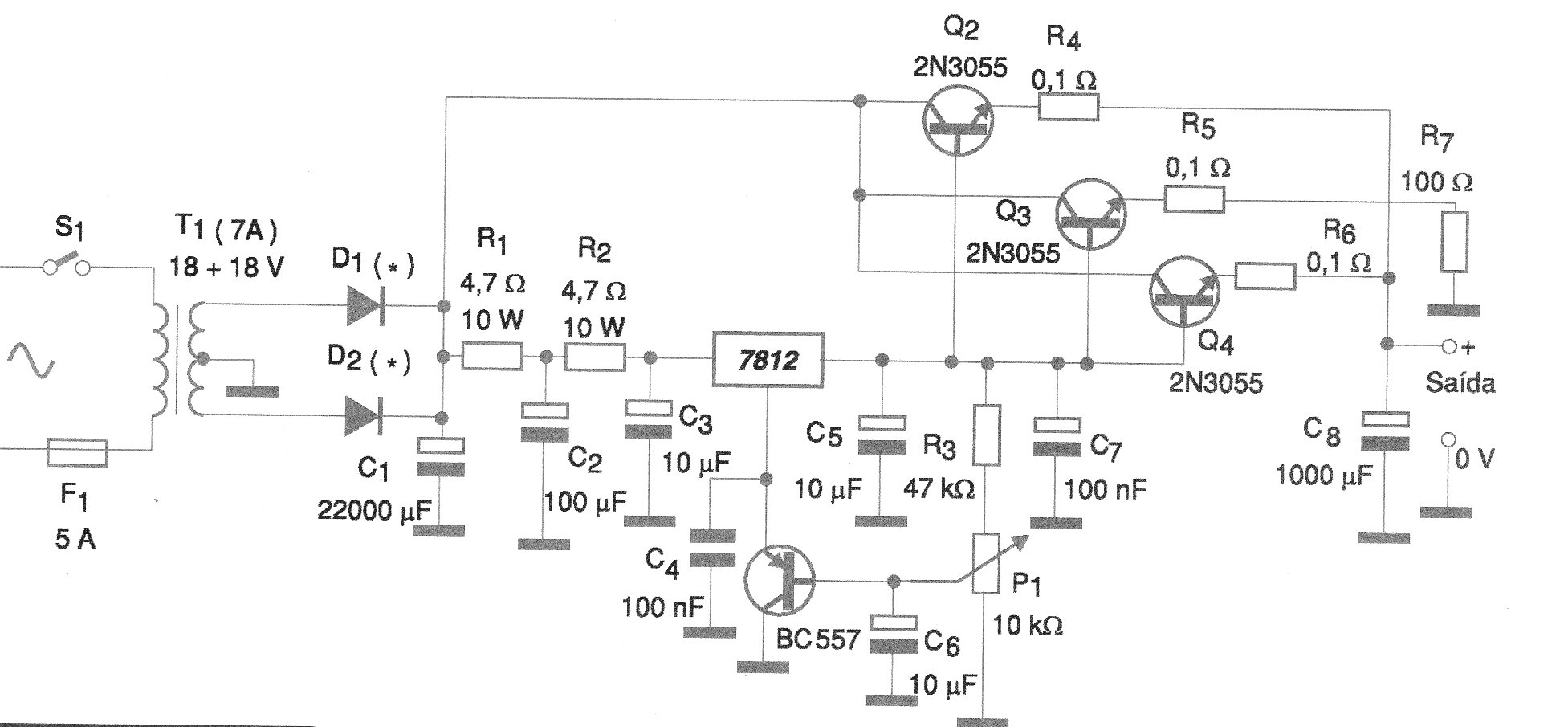 R1, R2 - 4,7 ohms x 10 W - resistores de hilo