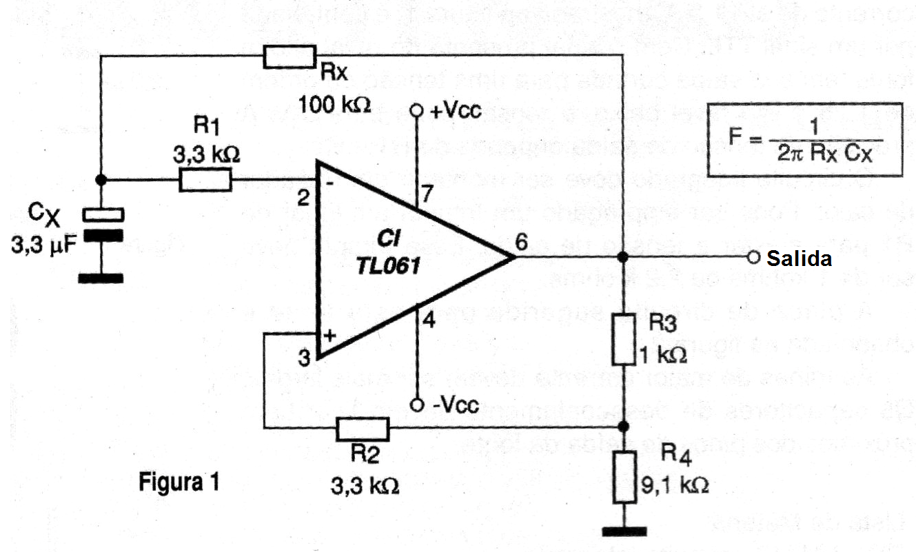 El oscilador de relajación con amplificador operacional mostrado en la figura 1 genera una señal de frecuencia muy baja determinada por Cx y Rx.