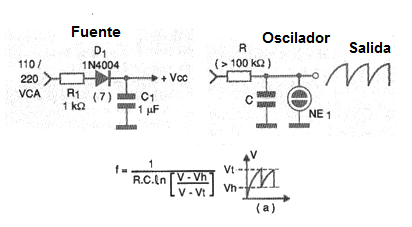 Si bien se trata de una configuración ya superada, pues podemos tener osciladores con componentes más modernos, se trata de una opción interesante para quien necesita una señal de baja frecuencia diente de sierra con gran amplitud.