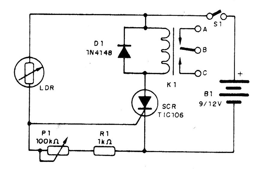 Este relé dispara cuando incide la luz en el LDR y así permanece aunque la luz sea un pulso de corta duración. El circuito es extremadamente sensible y puede ser disparado por una linterna a decenas de metros de distancia.