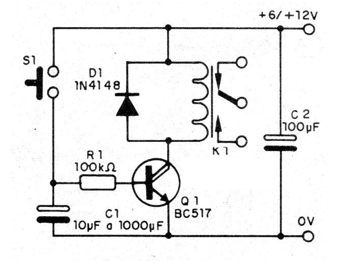 En la figura 1 tenemos un temporizador simple que utiliza sólo un supertransistor BC517 y que acciona un relé por intervalo de tiempo que depende tanto del valor de C1 y de R1.